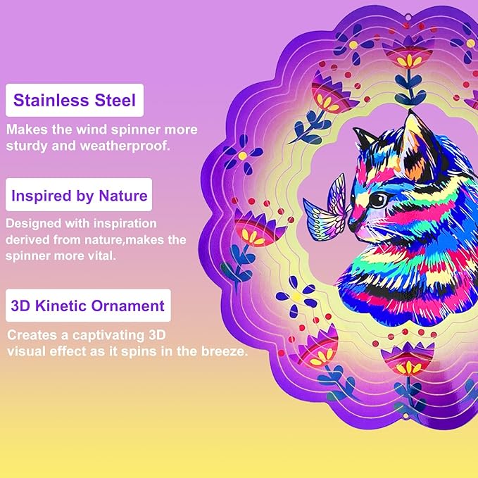 - 【3D Kinetic Wind Spinner Decoration】The dynamic wind spinner adopts a colorful appearance and is inspired by the animal image of a cat. The unique design combines a 3D streamer effect to make it look more visual.