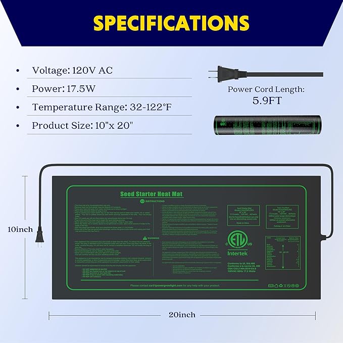 - Heating pad specifications: Size: 10*20 Inch; Wattage: 17.5W; Voltage: 120V; Material: PVC;Protect cold-sensitive plants and improve plant survival rate.