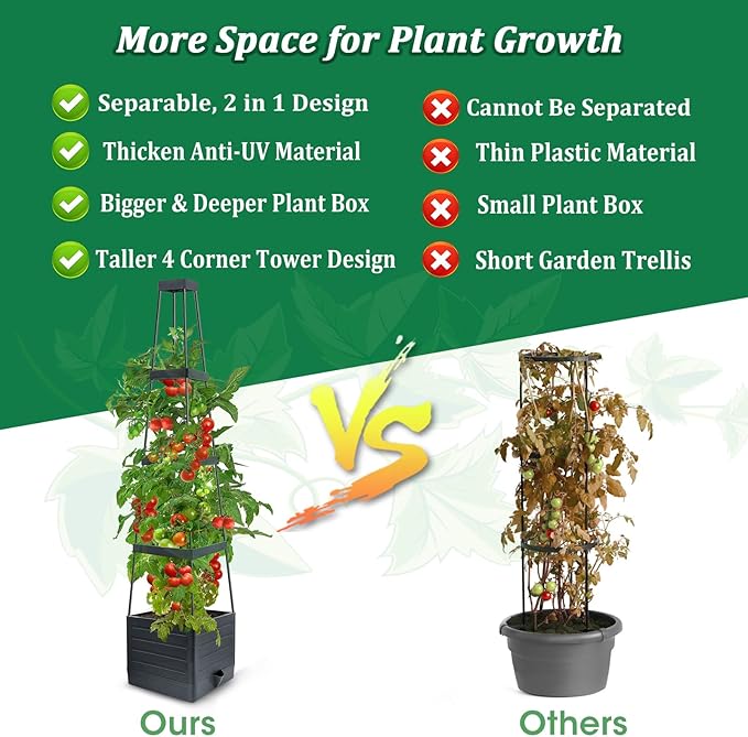 - 【Premium Material】: This tomato planter boxes made of fade-proof, anti-uv and premium PP material, trellis support use high-quality PE for rust-proof, fade-proof and anti-aging.This Raised garden bed & Trellis support safe and durable withstand for any outdoor areas in any weathers, also can be used years round in an enclosed sun room.
