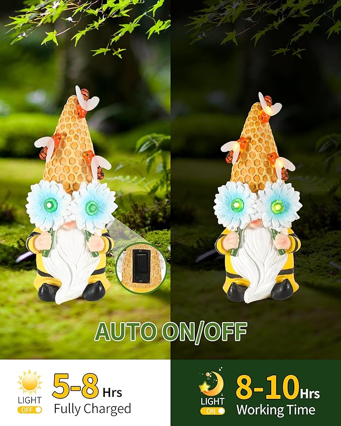 - 🐝 Charming Bee Lights - The bees’ tiny LED lights create an enchanting ambiance, making this gnome perfect for garden parties, birthdays, or simply brightening up your yard.