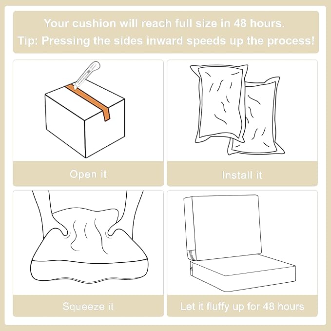 - Size Selection - Set includes a seat bottom measuring 19” W x 19” D x 3” T and a cushion back measuring 19” W x 16” H x 3” T. ( The size description is only for the cushion size, accurately measuring the dimensions of your furniture's seating area in advance, make sure the cushion size fits your furniture ). Slight size variations (±0.5") may occur due to handcrafted cutting. Please allow 48 hours for cushion to fully expand after opening.