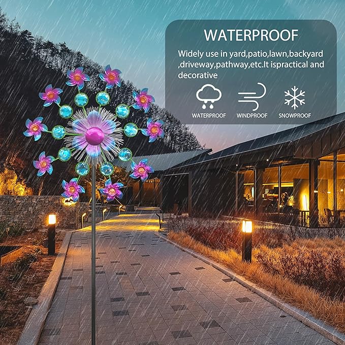 - 【Easy installation】The wind spinners are very easy to install, just tighten all the components and insert them into the ground or lawn to decorate your yard, garden, etc. The colored LED lights will automatically turn on and can last for 8 hours or longer at night.