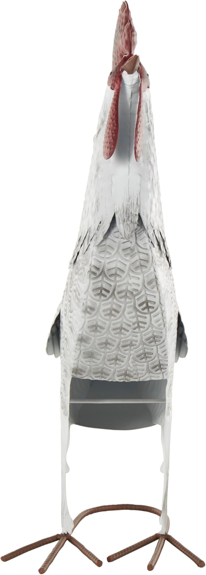 - WHITE AND BLACK MATTE FINISH A rooster garden sculpture that showcases orange, black texturing, and red accents, portraying a timeless aesthetic with its matte white finish