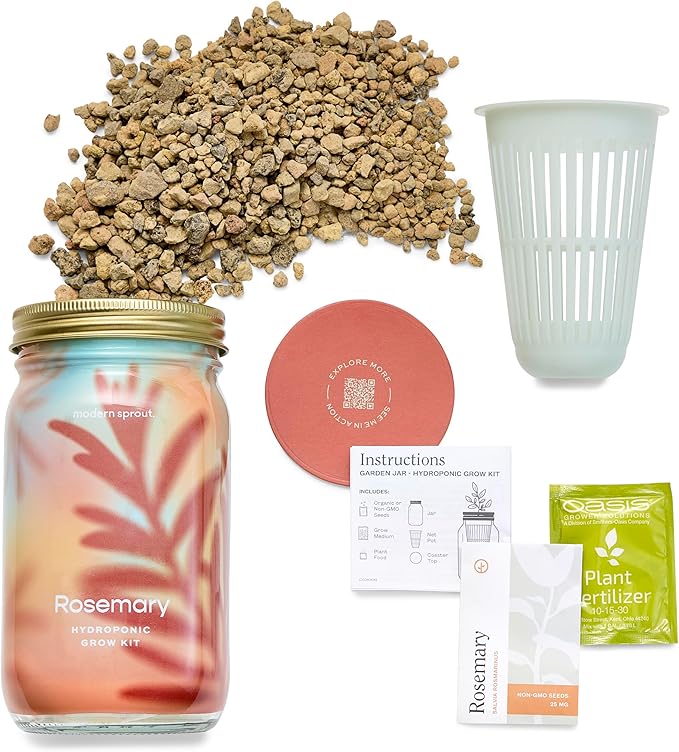 - Package Contents: 1 unit of hydroponic rosemary grow kit featuring a mason jar with a removable sleeve made from recyclable materials (6" high by 3.5" wide, weighing 1 lb), organic non-GMO rosemary seeds, a 100% recycled HDPE net pot made in the USA, lava rock grow medium sourced domestically, plant food, coaster, and detailed instructions; Designed for reuse and proudly assembled in the USA, it offers a sustainable way to grow fresh herbs indoors