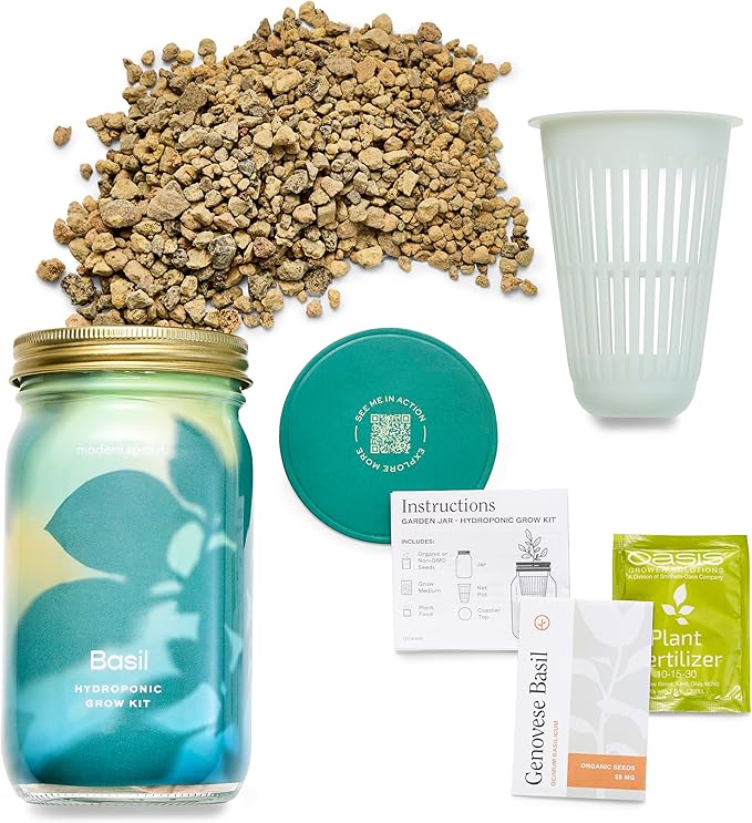 - Package Contents: 1 unit of hydroponic basil grow kit featuring a mason jar with a removable sleeve made from recyclable materials (6" high by 3.5" wide, weighing 1 lb), organic non-GMO basil seeds, a 100% recycled HDPE net pot made in the USA, lava rock grow medium sourced domestically, plant food, coaster, and detailed instructions; Designed for reuse and proudly assembled in the USA, it offers a sustainable way to grow fresh herbs indoors