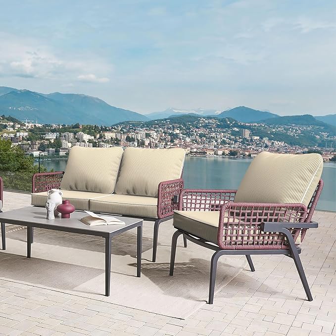 - āMaterial: Made of 100% durable polyester fabric and soft filling material. Itās water repellent and fade-resistant. Wonāt fading under the direct sunlight over 500 hours. Cushions are filled with 28D high resilient foam, overstuffed construction for enhanced comfort and longevity.