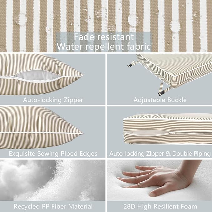 LVTXIII Outdoor Deep Seat Cushion Patio Seat and Back Cushion Set Seasonal Chair Cushion with Removable Cover and Adjustable Buckle for Home and Garden, 24"x24"x4", Strip Beige