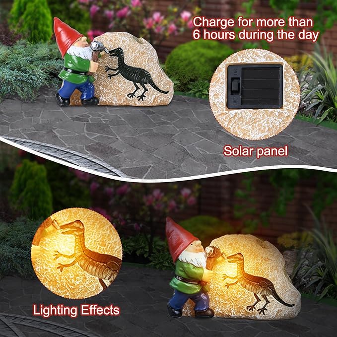- 【CUTE GNOME STATUE】This garden gnome statue holds a hammer and carves a dinosaur on a solar resin stone,this solar garden archaeology gnome statue is a great decoration to yard,flowerbed,walkway,patio,lawn.light up warm lights every night to welcome your family or friends, add some wonder and charm to your garden
