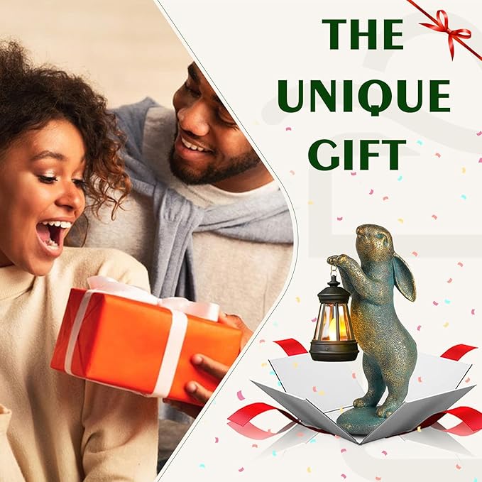 - Rabbit with Solar Lantern: The bronze rabbit statues hold a solar lantern, which casts a warm and welcoming glow. The light mimics a vivid small flame and flashes in the breeze. As the symbol of good luck, joy, and prosperity, the rabbit figurines are ideal for creating a warm atmosphere in the patio, yard, and porch.