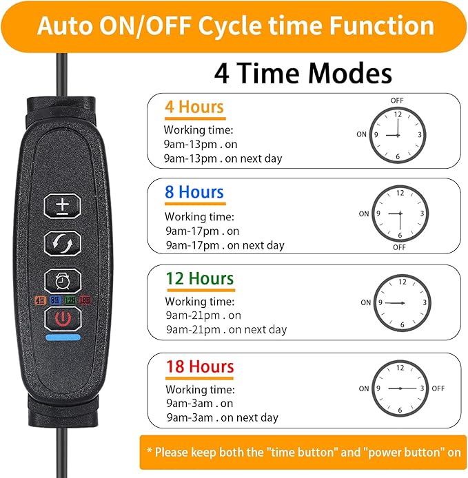 - 【Auto On/Off Timing Function】The plant grow light comes with a cycle memory timer function, which can Auto turn on/off every day according to your settings: 4/8/12/16 hours, the grow light will Auto turn on and off at the same time the next day, no manual operation is required, you can take care of your plants when you on work or vacation.