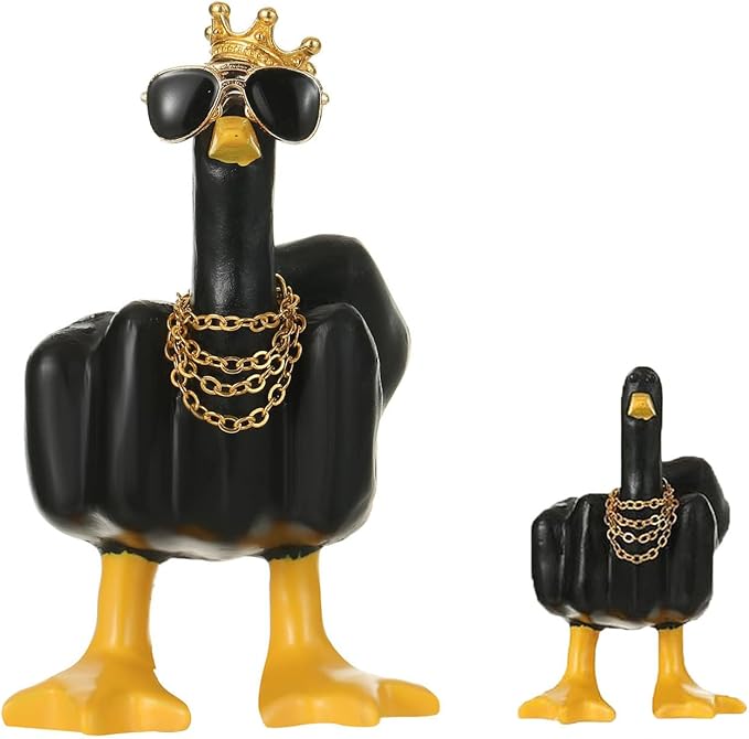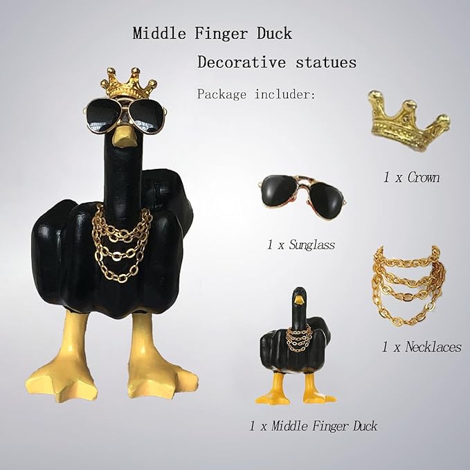 - New Design:The playful Middle Finger Duck is even cooler with the new addition of sunglasses, a necklace, and a crown that will make anyone who sees it smile and add a touch of fun to their lives, whether it's at home or in the office