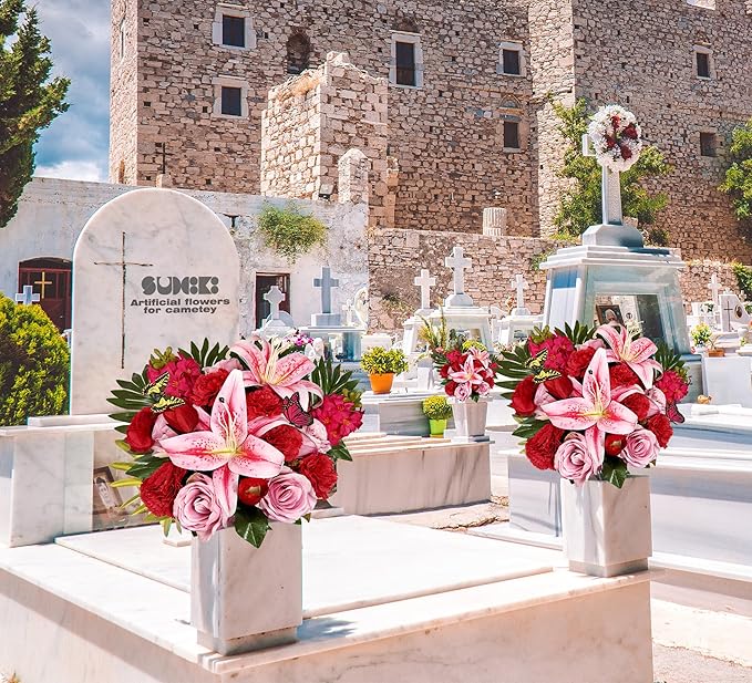 - Real Looking :Compared to other fresh flowers that wilt easily,memorialize your loved one with the blend of different bright colors artificial grave flowers are very vivid. You only switch out arrangements as the seasons change as you want