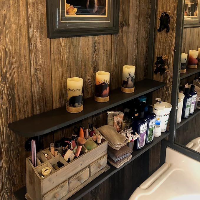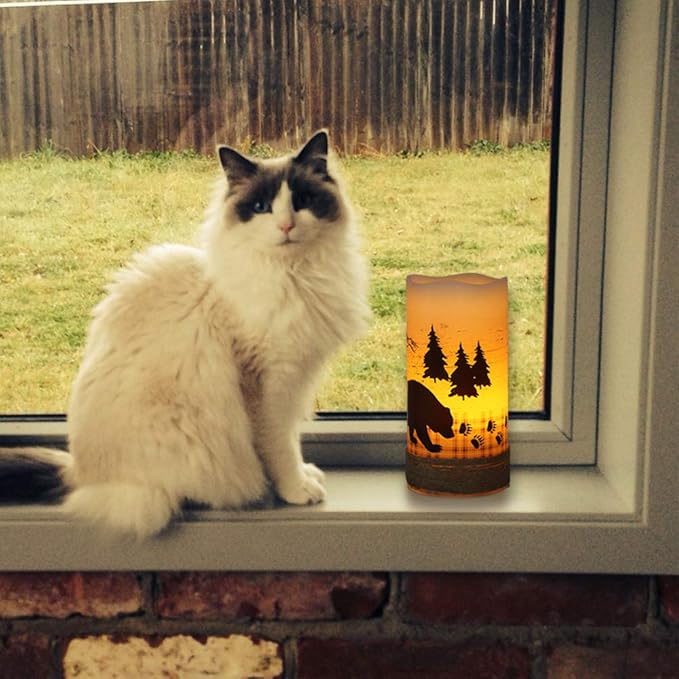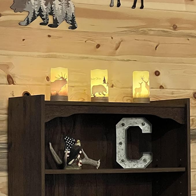 - REAL WAX &DECALS DECOR DESIGN:The flameless candles are made of real wax and have hemp ropes, bears, deer, and elk as sticker decorations. When you turn on the LED lights, the warm and soft light flact on the deer stickers makes you feel like you are in a dreamy forest, experiencing a sense of peace and warmth.