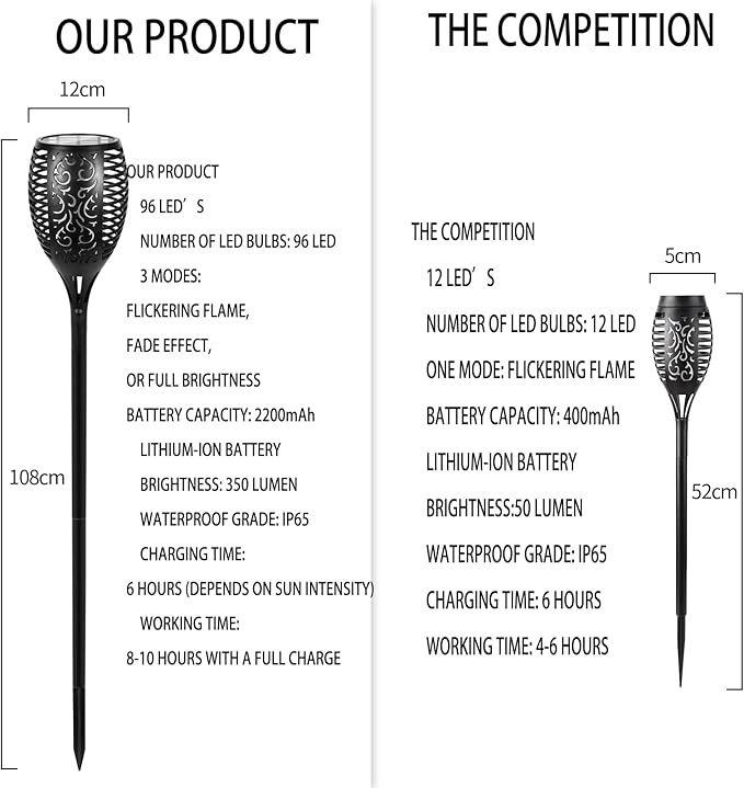 - Gorgeous Dancing Flames: Our self-charging solar lamps charge by day and turn on automatically at night. They have 3 beautiful modes; Flickering Flames, Slow Fade from On/Off/On, or Full Brightness. They are gorgeous and attractive and look fantastic as decorative outdoor lighting. Whether lining pathways and driveways, placed in gardens, or just used during the holidays such as Halloween or Christmas, these light can do it all