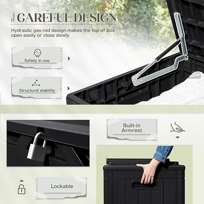 - PRACTICAL DESIGN: The deck box has a hydraulic holder design, which can prevent your hand from being caught when you open and close the box to ensure safety. Meanwhile, there is a support bar designed inside the lid, which can enhance the durability of the storage box.