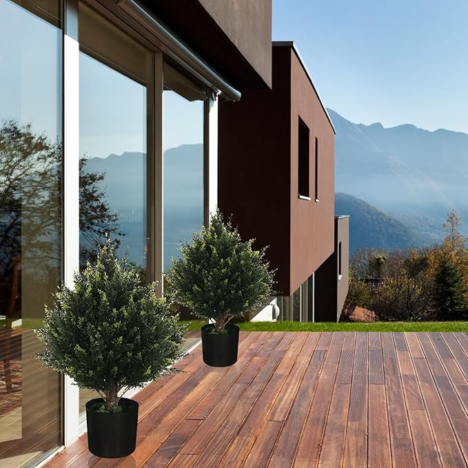 - Product size: The topiary trees artificial indoor in outdoor is19”*13”*13”, provided with a black plastic flowerpot with 4.5 inches height and 5 inches width. The height of cedar is measured from the bottom of flowerpot to the leave atop the cedar, and the width of cedar is measured from the leftmost leave to the rightmost leave,The products are made manually. It is normal to have 1 inch error in measurement. Please be prudent in buying if you mind it