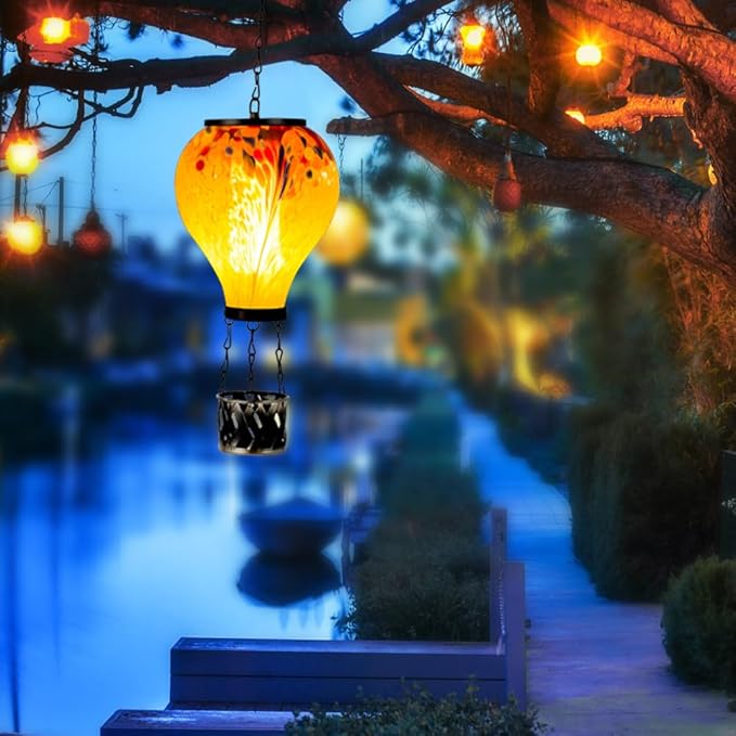 - 【Wide Application】Solar hot air balloon lantern with flame is a great home decor. Outdoor lanterns for patio waterproof with a metal "S" shaped hook can be easily hung on balcony, porch, garden or tree and other places.