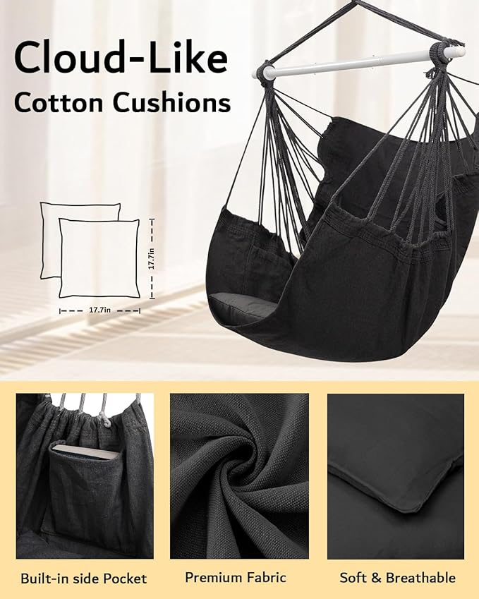 ADVOKAIR Hammock Chair Swing (500 lbs Max-2 Cushions) - Hanging Hammock Chair Rope Swing Indoor for Bedroom, Outdoor, Patio, Bedroom, Porch, Deck - Sturdy Steel Bar with Anti-Slip Safety Rings