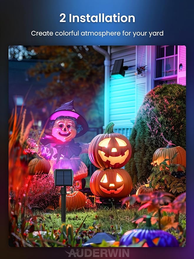 - Easy Installation & 2-in-1 Function: Enjoy hassle-free setup with our 2-in-1 installation design, allowing you to effortlessly mount the RGB solar spotlights on walls or securely stake it into the ground, offering unparalleled flexibility for your lighting needs
