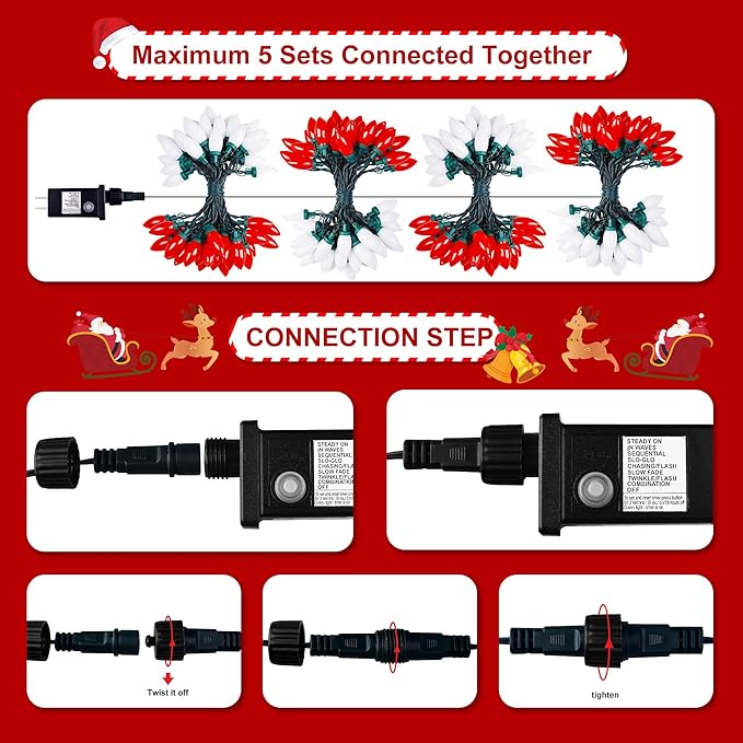 - LIGHTING MODES & TIMER FUNCTION - Up to 8 different light mode, A variety of options to meet your various needs. The Christmas lights come with timer function. Long press 3s until the button's green lighting light up, that mean the timer is activated; if the green light off, it means the timer is inactivated.