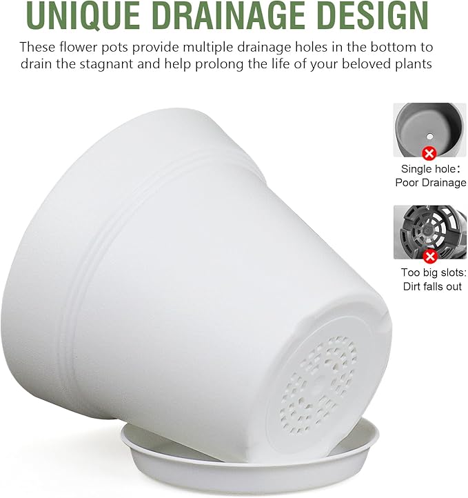 - 【Drainage Holes and Trays】Each plant pot features well-designed drainage holes at the bottom to ensure proper water flow. Additionally, saucers catch excess water, keeping your growing area clean and tidy while also ensuring that your plants remain hydrated without becoming waterlogged.