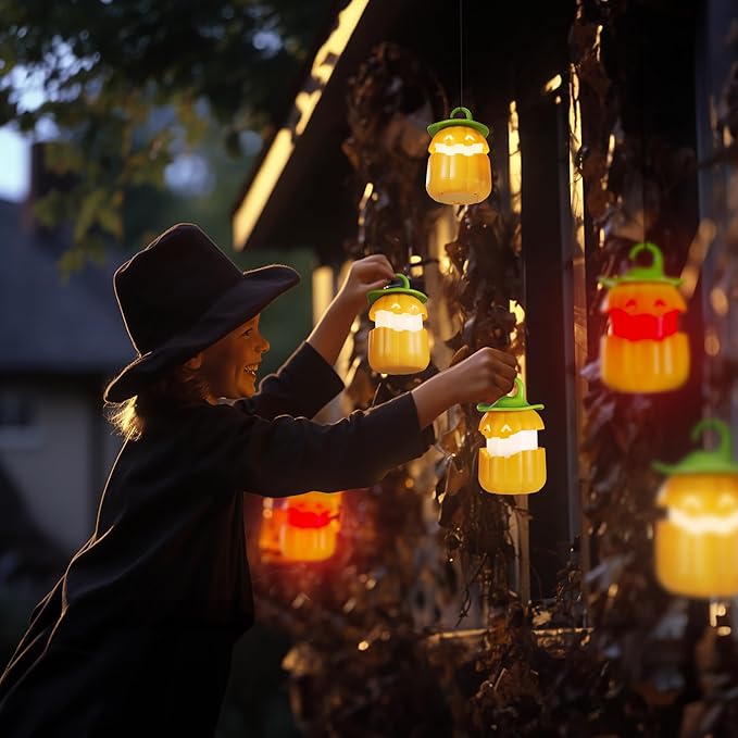 - Lightweight and Portable: The size of the Halloween pumpkin light is 89*89mm, which is lightweight and compact, and you can easily store it in your cabin, backpack. The pumpkin lantern comes with a hook which can be hung on windows, fireplaces, porches, gardens, trees, bookshelves, stairs, etc. You can also carry it on Halloween night, and it will make your Halloween party stand out