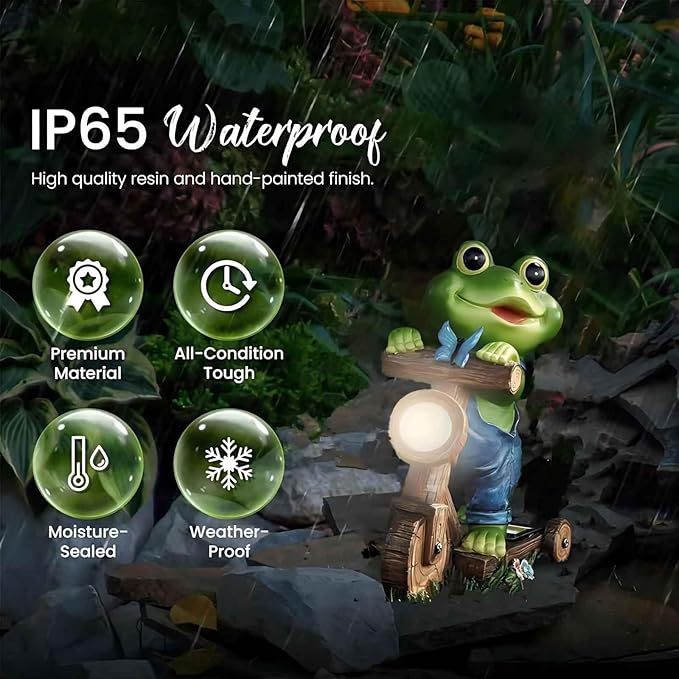 - ใ๐๐๐๐ ๐ ๐๐๐ ๐ ๐๐๐๐๐๐๐๐ใ How funny and adorable solar frog garden decor it is. This outdoor frog garden decorations will into your heart. Its design is so unique and modern, a lovely and vivid frog sitting on a small bike/bicycle, which makes you feel very interesting and surprising. it is fun to your garden,study or balcony. In addition, its hand-made production process is also very fine, and the detail is handled very well, which makes you feel very satisfied. Overall, this solar frog yard statue is an excellent artwork that will add a unique charm to your living area, whether it is placed in the garden or on the balcony.