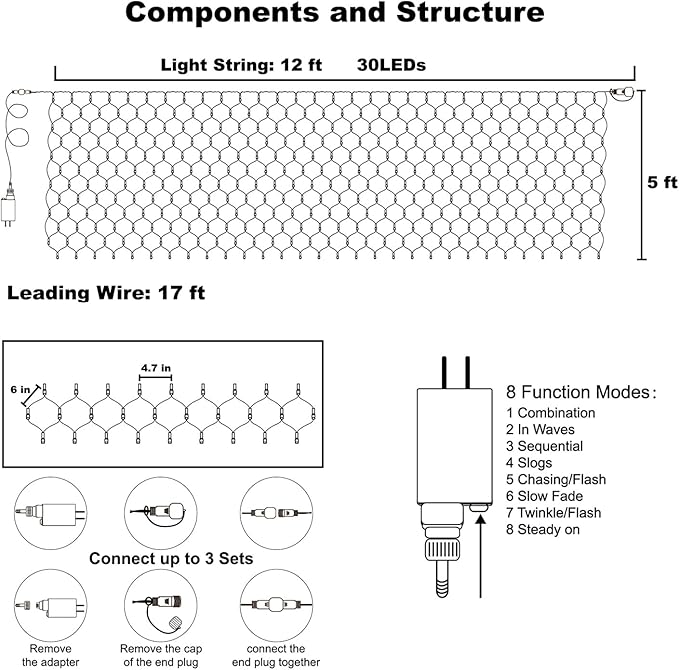 - Christmas Net Mesh Lights: Red and green net decorative lights, come with super bright 360 LEDs and UL Certified adapter. Low voltage plug, safety voltage for human body. Enjoy the twinkling net lights pleasantly. Mesh panel size 12ft x 5ft with 17ft lead cable. Can be extended to a maximum of 3 light chains (maximum 1000 LED), to decorate your lighting area with the desired length