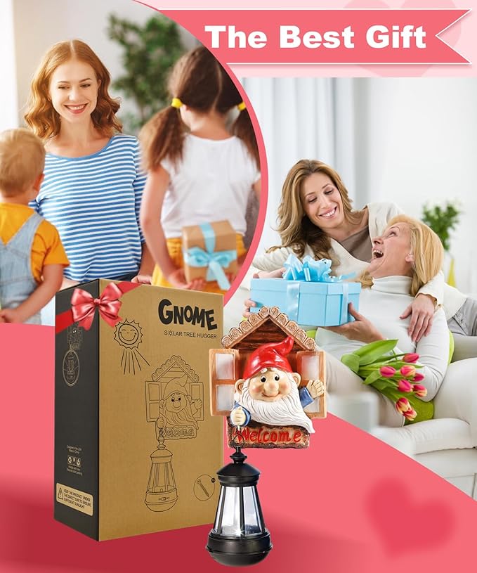 Gnome Tree Hugger with Solar Lantern - 10.6 Inch Resin Gnome Statue for Outdoor Garden Decor, Ideal Gnome Gifts and Gnome Statue Outdoor for Gnome Lovers