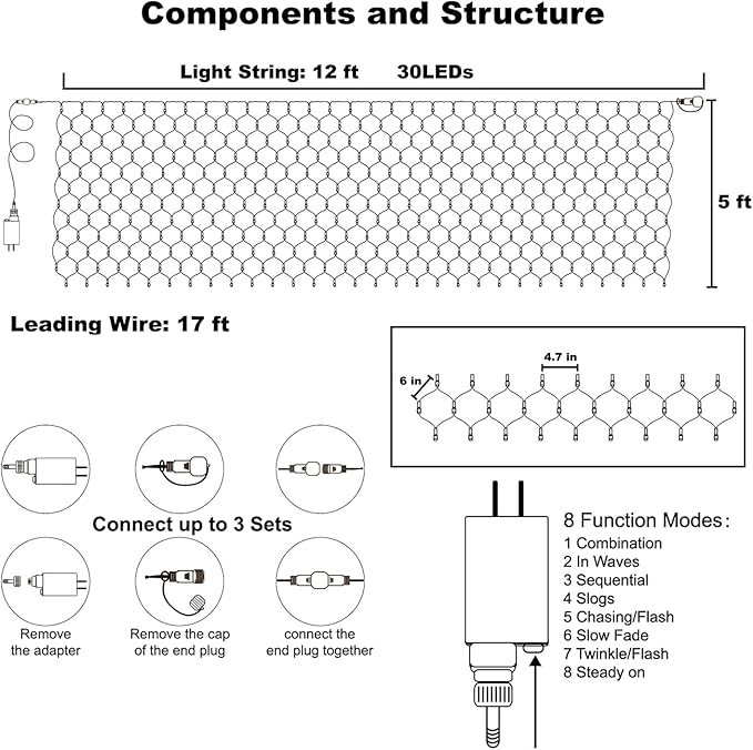 - 8 Lighting Functions: Our Christmas mesh string lights have 8 lighting modes-combination, in waves, sequential, slogs, chasing/flash, slow fade, twinkle/flash, and steady on. Fit different occasions, moods, feelings, holidays, festivals, anniversaries, etc. Pressing the round button on the transformer to change the lighting modes