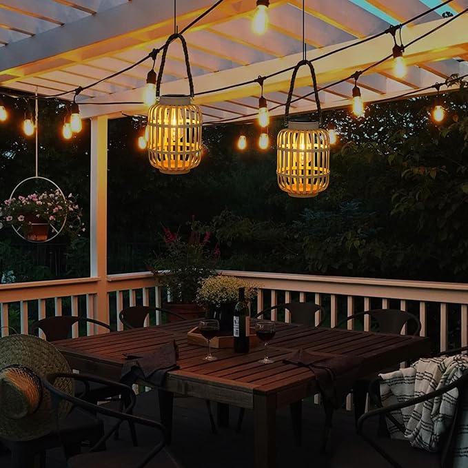 pearlstar Outdoor Solar Lanterns Light Rattan Natural Lantern with Handle for Hanging or Table Lamp for Patio Yard Garden Wedding Home Decoration, Edison Bulb, Auto on/Off (Style 4)