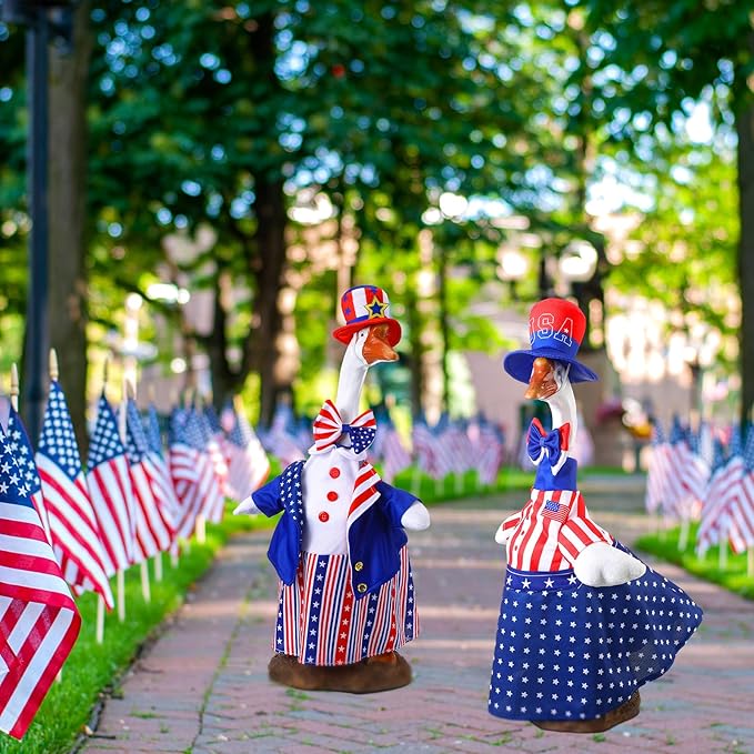 - Fourth of July Goose Outfits Decor: these patriotic porch goose outfits are designed with an adorable and beautiful aesthetic in mind; The vibrant colors to catch everyone's attention, adding a visually engaging detail to your lawn, garden, or backyard; Dress up your cement or plastic goose in style and watch how they attract admiration
