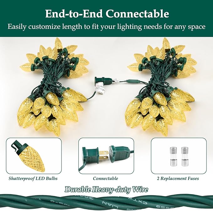 - đăShatterproof C9 Strawberry LED Bulbsă Each strand of string lights is 134 feet long and equipped with 200 bright C9 strawberry-shaped LED bulbs. They are easy to use - just plug and unplug for ON and OFF - and long enough to wrap around a Christmas tree or anywhere else you'd like to add some light, such as your porch, garden, lawn, yard, or roof.