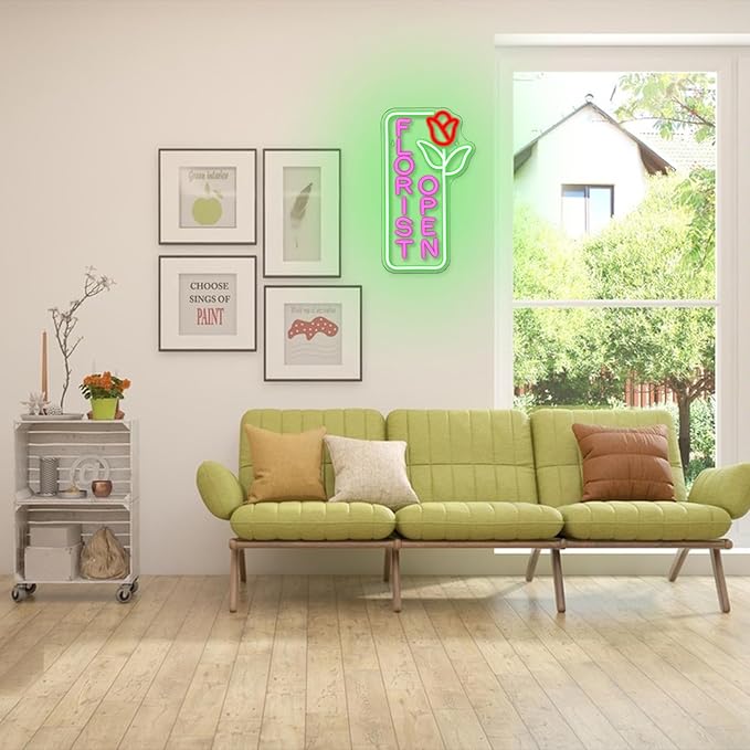 - Novel design:The neon lights in the flower shop are composed of green and red tulips and pink flower shop letters. A romantic garden neon sign is the best gift for decorating a lover, friend's flower shop, and bedroom.