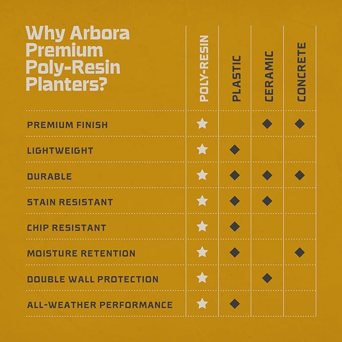 - Weatherproof & Durable - Constructed with resilient resin, Arbora pots are weatherproof and fade-resistant, maintaining their integrity season after season. Featuring double-walled insulation, experience superior plant protection in any weather.