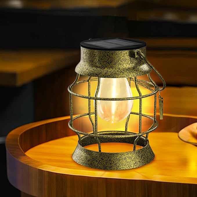 - Vintage Metal Solar Lights : Traditional metal vintage solar lights outdoor waterproof lights exude timeless elegance and charm, distilling the essence of classic design with a hint of retro allure. Our outdoor hanging solar lights are complemented by bronze openwork iron rim strips that give off an alluring glow. Perfect for decorating your garden or patio, it exudes a delightful vintage vibe.