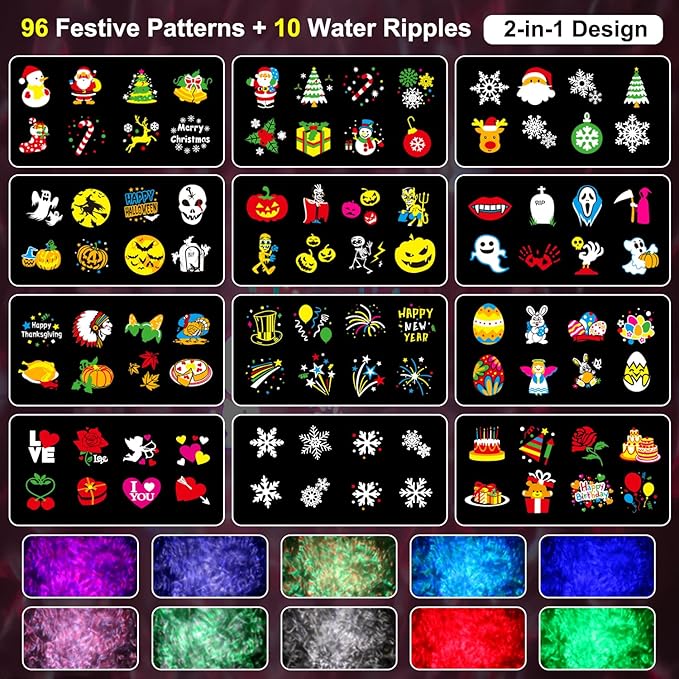 - More Brighter and Clearer: We have upgraded our HD digital projection technology and solved the issue of slide fading, with a longer lifespan. Unique 2-in-1 projection effect with 96 patterns and 10 water wave color effects. You can combine different effects according to your preferences. Our projector light is brighter and has clearer and more patterns than similar projector lights on the market, creating a more immersive projection effect
