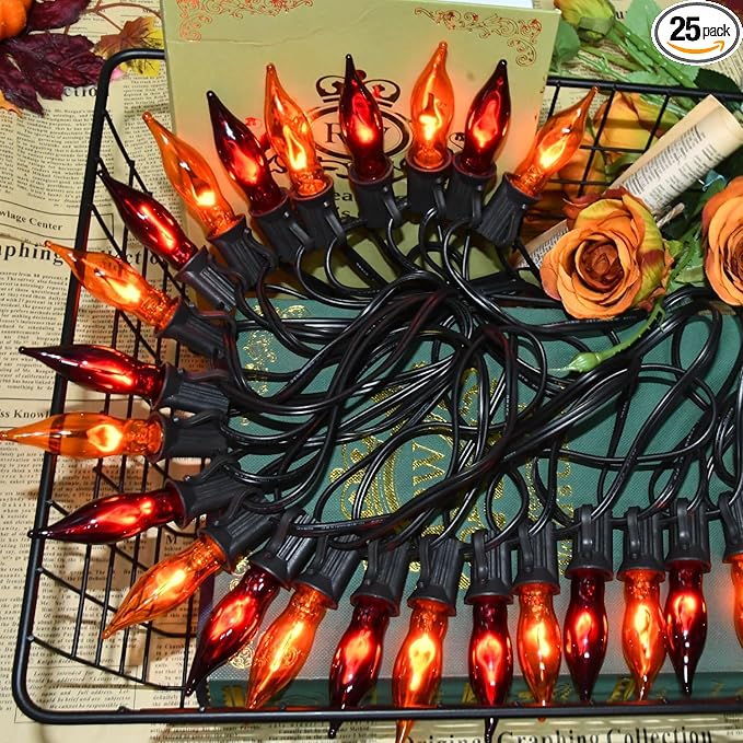 - đ„ăWidely Application Halloween Outdoor String LightsăOur purple orange Halloween lights fits C7/ E12 base and widely application for Christmas Halloween tree lights, Halloween fireplace decor fake fireplace lights, Halloween party lights, Halloween home decor lights, Halloween haunted house decorations, birthday decor, weeding decor lights and more, create a relaxing and cozy atmosphere.