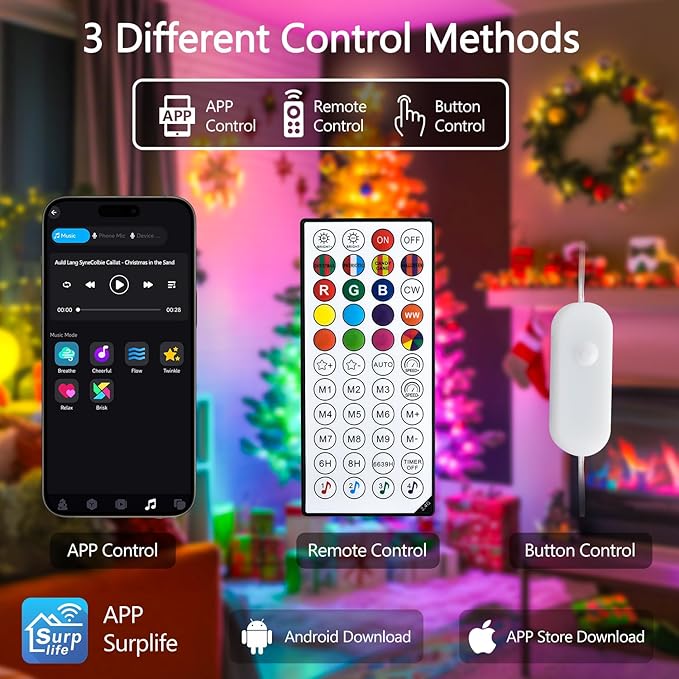 - App & Remote Control: Use the app to customize colors, modes, brightness, speed, group control, and timing. Some functions can also be controlled via the remote. Tailor the lighting to suit your preferences