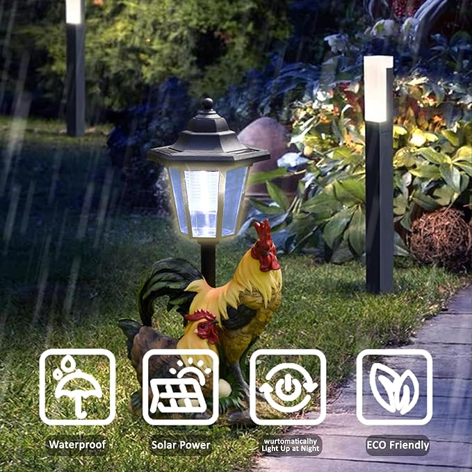 Solar Garden Outdoor Statues Rooster Hen Couple with Light, Outside-Outdoor Decorations Chicken Sculptures for Patio Yard Lawn Walkway Ornaments Clearance Gifts for Mom Grandma Birthday