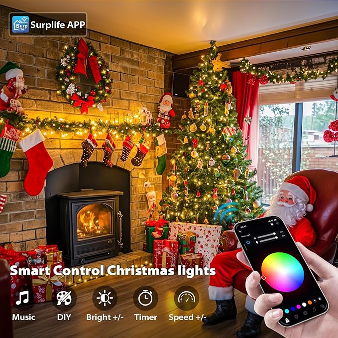 - EFFORTLESS CONTROL WITH REMOTE & APP: Experience the ultimate convenience with dual control options. Use the intuitive remote or seamlessly connect to smart Christmas lights dedicated "Surplife" app(available on both the App Store and Google Play) to adjust colors, switch between modes, and fine-tune brightness. Whether you’re hosting a gathering or unwinding at home, only transform with just a tap, making every moment feel special