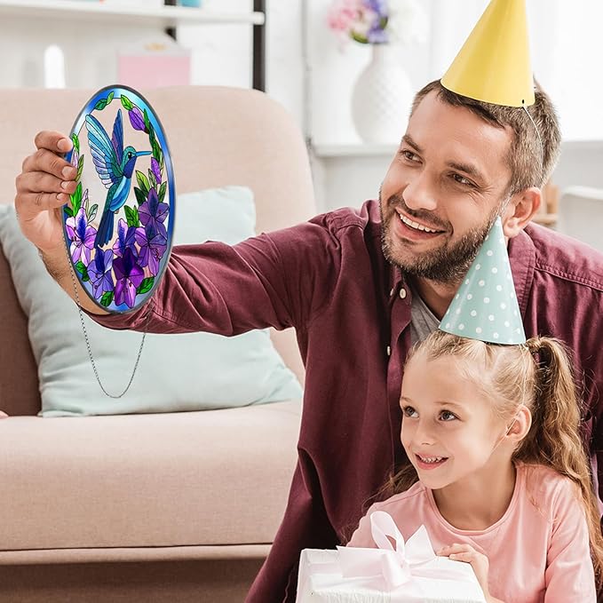 - 【Stunning Stained Glass Decoration】Add a touch of vibrant elegance to your home with this exquisite stained glass hummingbird suncatcher. Featuring intricately designed hummingbirds amidst colorful flowers, this 8.6-inch masterpiece beautifully captures the essence of nature's splendor.