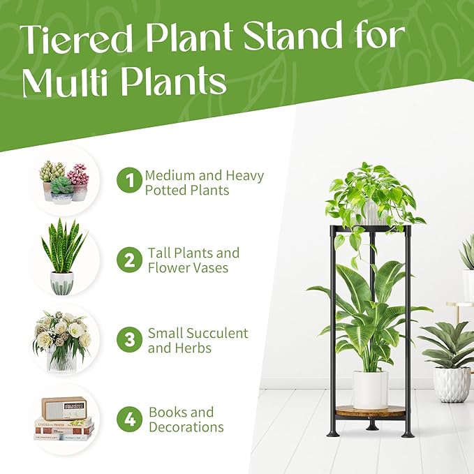 - 3-minute Easy Assembly: The structure of the plant stands for indoor plants multiple is uniquely simple and comes with a complete installation kit with clear instructions to help you assemble it completely more easily. The 2 tier wrought iron plant stand comes with 3 adjustable foot pads to protect the floor