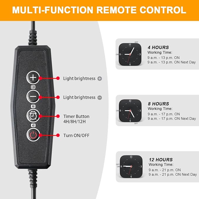 - A Versatile Controller: This growth light offers 3 timing options, enables you to keep the light on for 4/8/12 hrs. It is supposed to last for 2000 cycles and only needs electricity $2.00 (12 hrs/day) every month. That's a good value for the cost. In addition, you can adjust the brightness according to your needs.