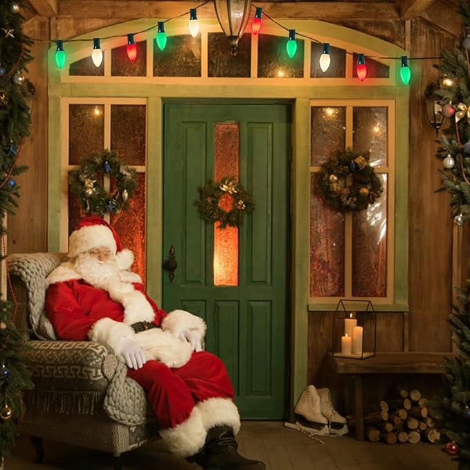 - C7 LED Red White and Green Christmas Lights: 25Ft led outdoor christmas decorations string lights with shatterproof C7 red white and green bulbs provide a classic holiday color scheme, perfect for creating a cheerful and traditional Christmas atmosphere. C7 Christmas lights glow a natural warm lights, create a vintage effect or antique ambiance & romantic atmosphere for christmas. led christmas lights outdoor perfect for outside christmas tree garden patio yard cafe tent porch deck party backyard decorations and lighting