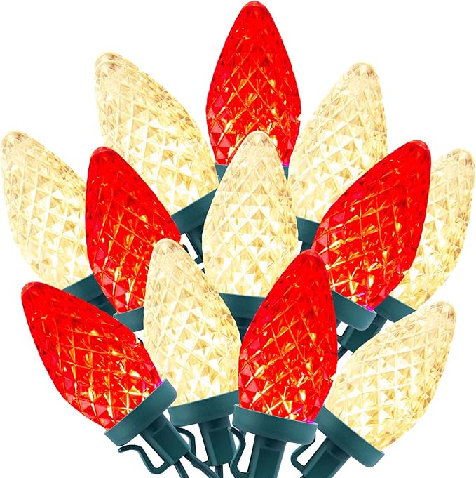 - 【 Brilliantly Bright Glow 】- These Christmas light strings feature large, faceted C9 bulbs made from durable polycarbonate, offering good brightness, colour saturation, ruggedness and reliability. Built-in SMD LED creates vivid lighting effects; the diamond facet hole design prevents stagnant water. Bulbs with vibrant colors will never fade, chip or crack