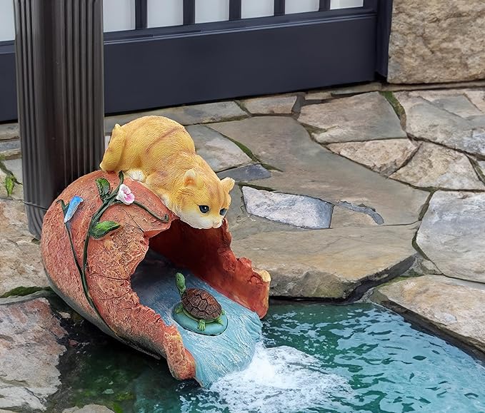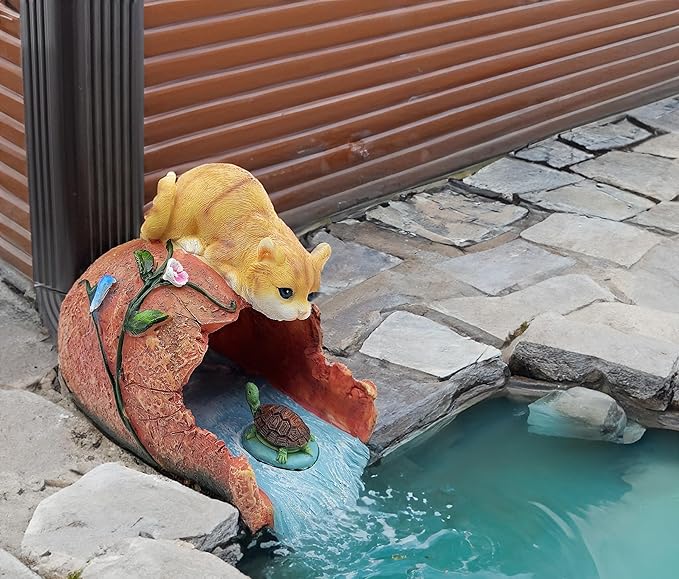 - Transform your garden downspout into a charming focal point with this decorative downspout extension, featuring a playful orange cat and turtle design.