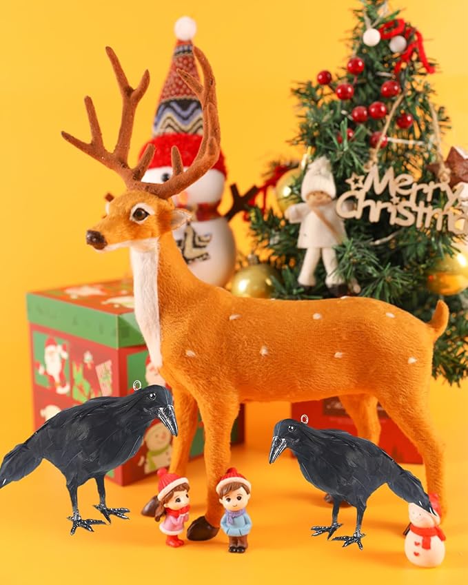 Hanging Dead Crows, 13 Inches Life-Size Raven, Realistic Handmade Fake Decoy for Garden Christmas Halloween Decorations [Face Up+Face Down+Stand] 2PC