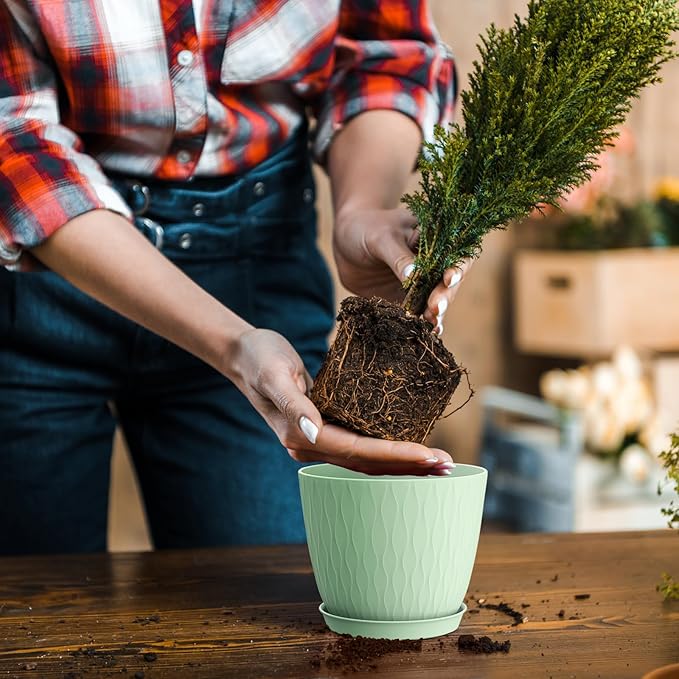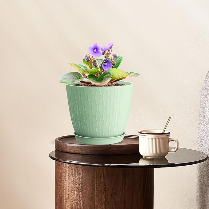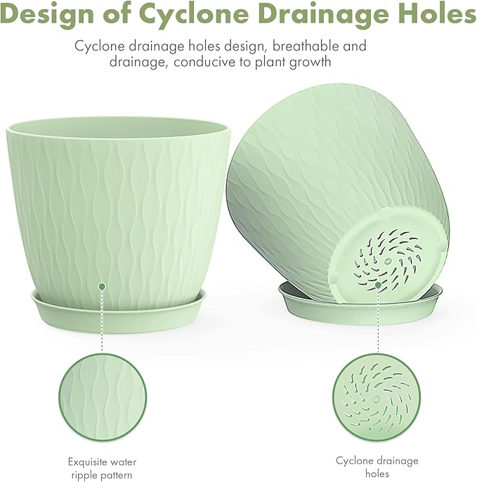 - [Sturdy PP material with Matte Finishing Exterior] There 6 inch plastic plant pots are made of 0.12inch thickness plastic. Be safety placed on the windowsill, home and office. Plastic pots are ligthweight, they tend to retain moisture, so you will water less frequently. And Easy to wash and reuse