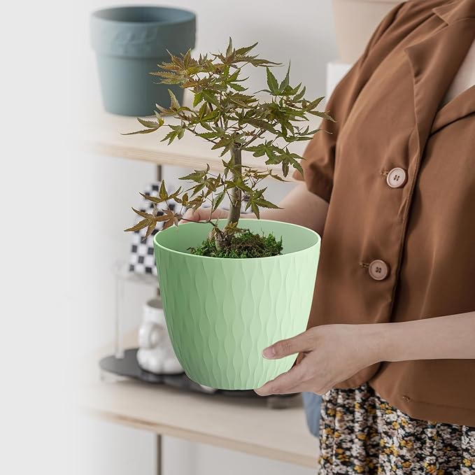 6 inch Plant pots, 12 Pack Modern Plastic Planters with Drainage Holes and Saucers for Repotting Indoor Plants and Flowers, Green